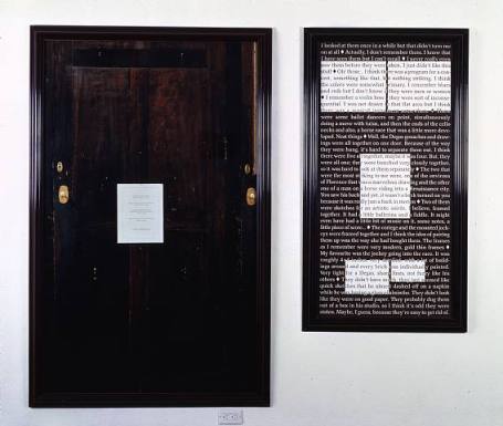 5. Ausencia. En el Museo Isabella Stewart Gardner, de Boston robaron unas obras de arte. Sophie Calle entrevistó a personas que habían estado en contacto con ellos: comisarios, guardas de seguridad, etc y les pidió que le contaran qué recordaban de los cuadros. La pieza muestra el espacio de la pared ( vacío) en el que había estado la pieza robada y el testimonio de los entrevistados. Ninguno recordaba lo mismo que el otro.